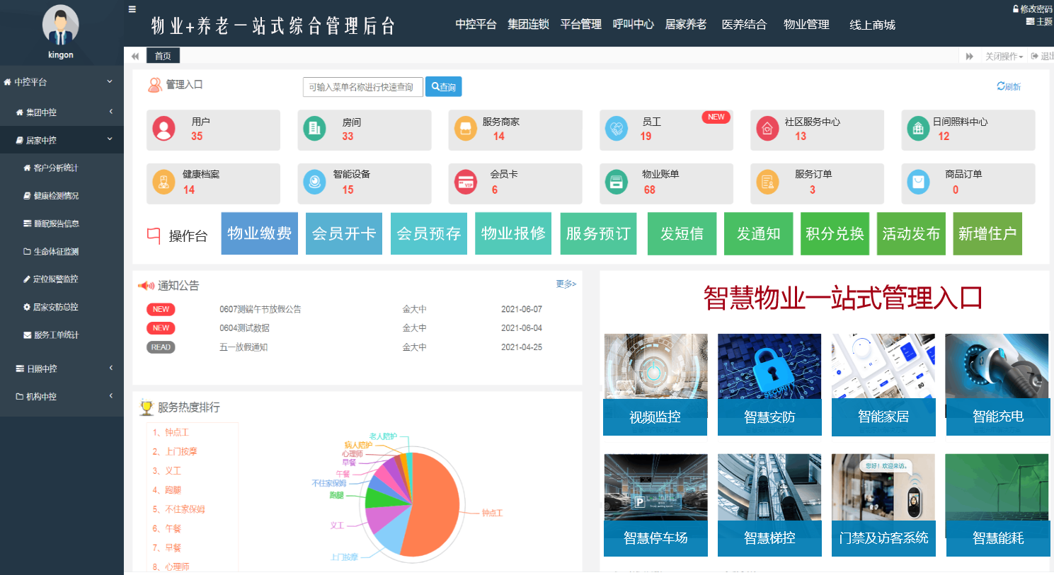 全网性价比高的Saas养老云平台【专业的云平台技术+丰富的成功经验+强大的功能管理】免费试用养老事业发展的助力二十年以上软件开发经验,打造一站式智慧养老解决方案免费试用打造养老多业态商业模式软件免费试用,选系统不再难 ● 提供社区养老、居家养老、机构养老、民政监管、智慧康养、医养结合等养老系统软件 ● 低成本,上线快,提供制定化开发,打造先进的“互联网+养老”新模式 免费试用金养通智慧养老平台,助您快速获客盈利全终端覆盖,满足所有业务场景,轻松上手免费试用 上一个 下一个 物业养老行业的解决方案 智慧物业+养老服务+社区新零售综合平台”,帮助物业公司转型发展,拓宽收入渠道。 申请试用 行业痛点 物业与养老如何结合? 物业开展养老服务没有经验该怎 么办? 如何解决物业固定收费利润低及养 老服务的问题 解决方案 一站式综合管理后台让有效的标准化流程落地 是整个信息平台管理的中控平台,物业企业可通过系统实现“集中管理、分权运作”的管理模式,可应用于多个小区。对物业管理、养老服务管理、其它业务或应用系统进行功能整合,方便物业企业统一管理口径,实现一站式操作管理。后台管理员拥有系统最高权限,各种管理功能用于支撑物业+养老项目的开展,并对各业务模块产生数据的进行查看,包括明细台账及统计分析报表、可视化数据大屏等。 一站式APP商业转型,实现物业增收 物业服务一键触达报修、账单查询、物业缴费、装修申请、场馆预定、访客通行等物业服务足不出户就能享受。线上商城—将社区用户转变为商业流量,用户下单购买产生收益后,平台从中抽取部分佣金,帮助物业公司的商业转型,实现物业增收。 物业管理端APP让每个老人的服务都能得到保障 物业管理端APP—涵盖了数据概览、数据中心、待办事项、今日动态。领导能实时了解本集团/本小区的运营情况。费用统计、停车统计、工单统计等模块形成一个数据中心,可以查看本集团/本小区的数据统计。还包含待审批请假、待申请延迟报修,管理员通过APP可随时随地的处理工作。将今日投诉量、场馆预定量、巡更次数、保修订单、车辆临时登记、临时摆展数、缴费人数、缴费金额合计进行汇总展示。 中控平台 将领导关注的房产数据、报事报修、小区停车、经营收益、缴费数据等在大屏上进行展示,统计其预存数据、欠款分布数据、实时收益指标。支持整屏显示或是分屏显示。 实现“集中管理、分权运作”的管理模式 物业集团管理后台是对整个平台数据的综合监管,物业企业可通过系统实现“集中管理、分权运作”的管理模式,可应用于多个小区。后台管理员拥有系统高级权限管理,各种管理功能用于支撑物业项目的开展,并对各业务模块产生数据的进行查看,包括明细台账及统计分析报表、可视化数据大屏等。 对接集成——智能安防 安防是物联网的一大应用市场,传统安防对人员的依赖性比较大,非常耗费人力,而智能安防能够通过设备实现智能判断。目前,智能安防核心的部分在于智能安防系统,该系统是对拍摄的图像进行传输与存储,并对其分析与处理。一个完整的智能安防系统主要包括三大部分:门禁、报警和监控。