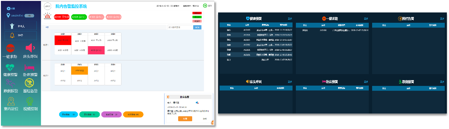 当发生各类报警时,硬件发出的告警可统一发送到告警监控系统,如定位终端、一键呼叫、电子血压仪、血糖仪、智能床垫等,时时监控管理老人安全、健康的情况,当有异常,系统自动弹出报警提示窗口,值班人员可以查看具体由哪个设备、关联哪个老人、具体在哪个位置,进行快速的应急处置。