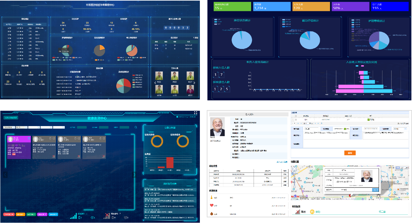 通过中央监控大屏实现对多种养老数据的动态地综合的展示,实时上传最新数据,使用系统可降低运营成本,实现统一管理,提升护理水平,降低对护理人员数量和专业程度的要求,提高养老院的管理服务的水平,为养老院创造良好的社会效益和经济效益,进而促进养老院的发展。