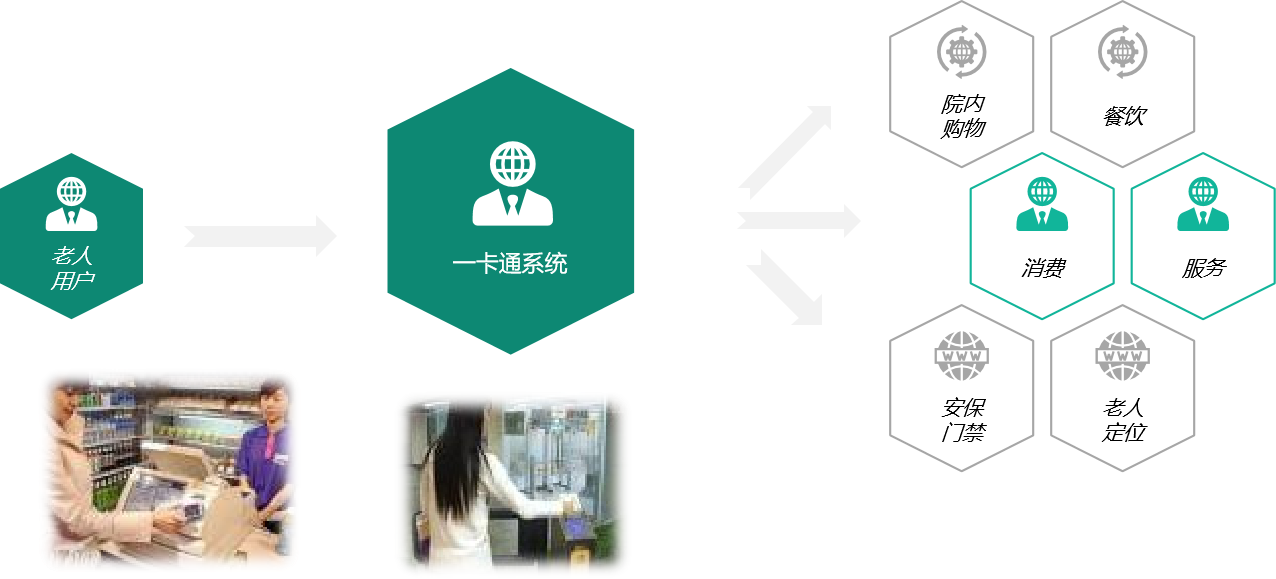 能在解决养老机构的管理的繁琐及复杂,将安保门禁、老人定位、购物、餐饮、服务、消费集合于一体,实现一卡通的管理模式,一张老人卡记录老人的行动轨迹及所有的消费明细。
