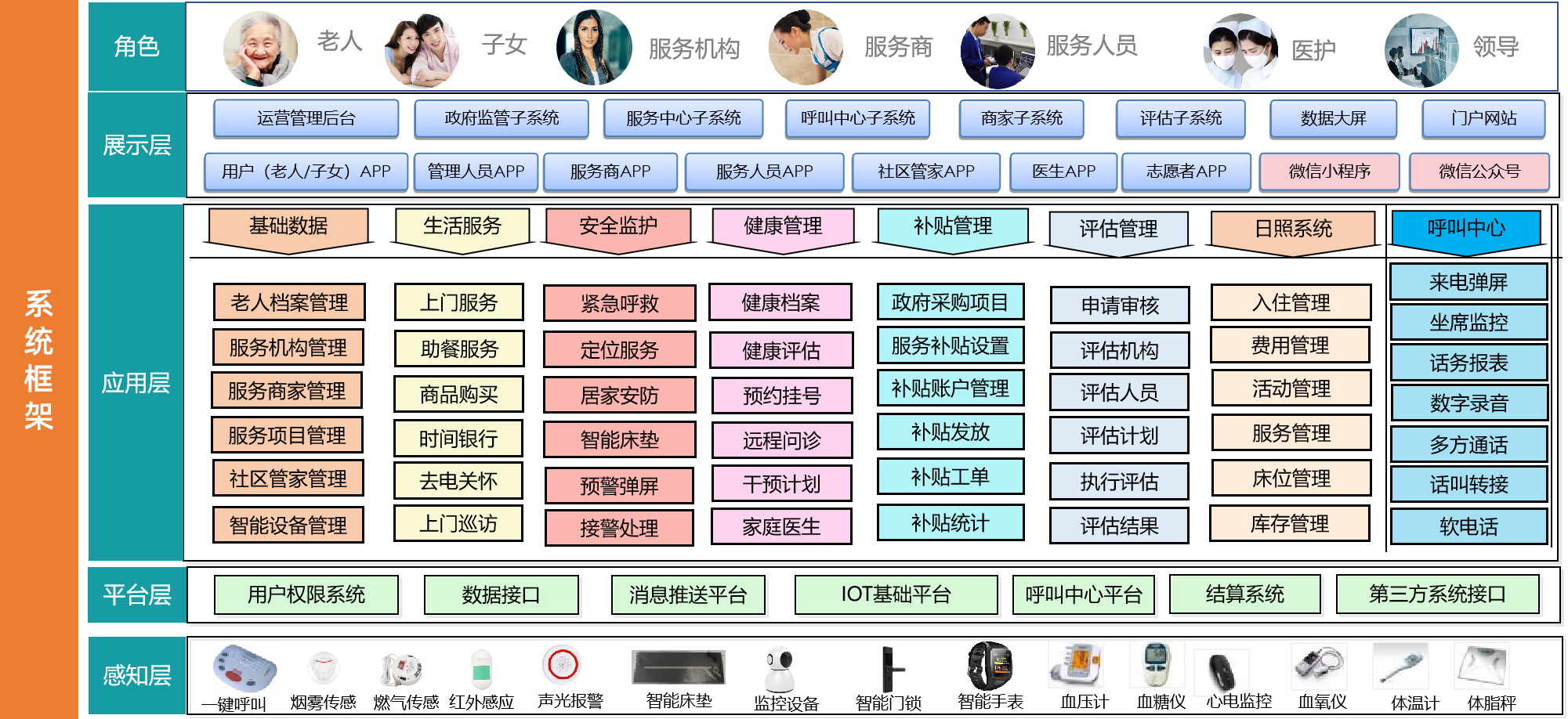 综合利用传感器技术、网络通讯、AI计算等,结合养老服务和老人的实际情况,围绕智能照护、健康管理、老人安全等核心需求,构建智慧化应用体系,利用先进技术提升服务质量,同时,也能够通过智能终端的应用,更加精准的获取老人的服务需求。