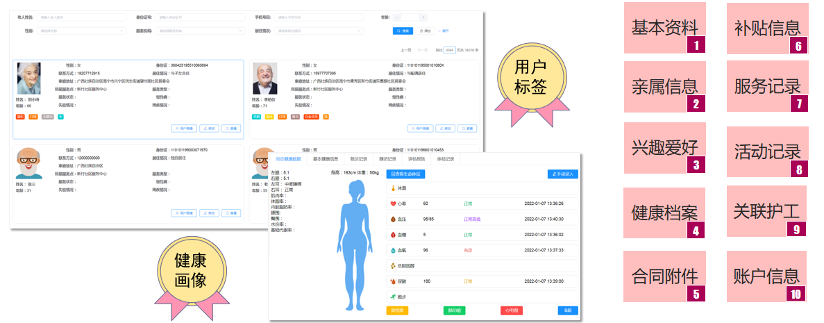 老人个人信息,家属信息,健康状况,兴趣爱好等信息进行动态统一管理。