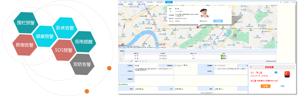 老人通过使用智能通讯终端一键拨打服务热线进行求助,平台地图能迅速获取老人位置。